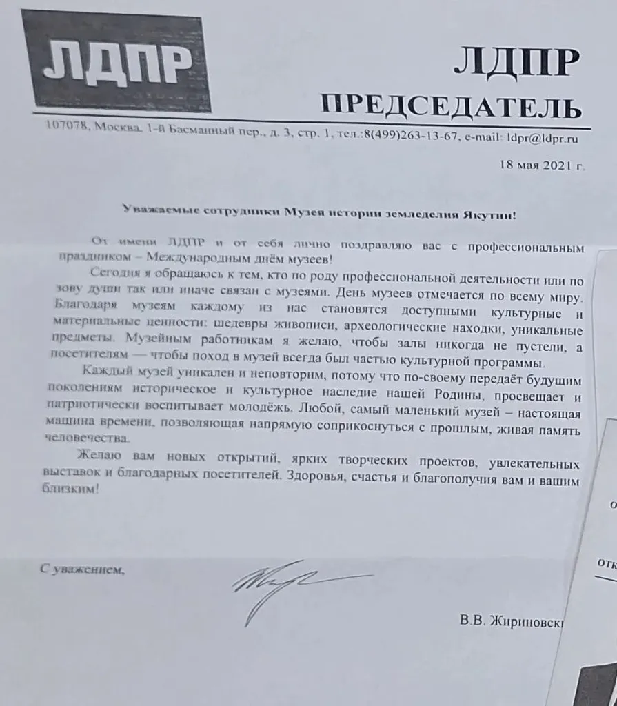 В разные годы, в Международный день музеев, в наш профессиональный праздник к нам приходили письма, подписанные Владимиром Вольфовичем, в которых он желал нам ярких творческих проектов, увлекательных выставок и благодарных посетителей. Писал о том, что «любой, самый маленький музей нашей Родины- настоящая машина времени, позволяющая напрямую соприкоснуться с прошлым, живая память человечества».